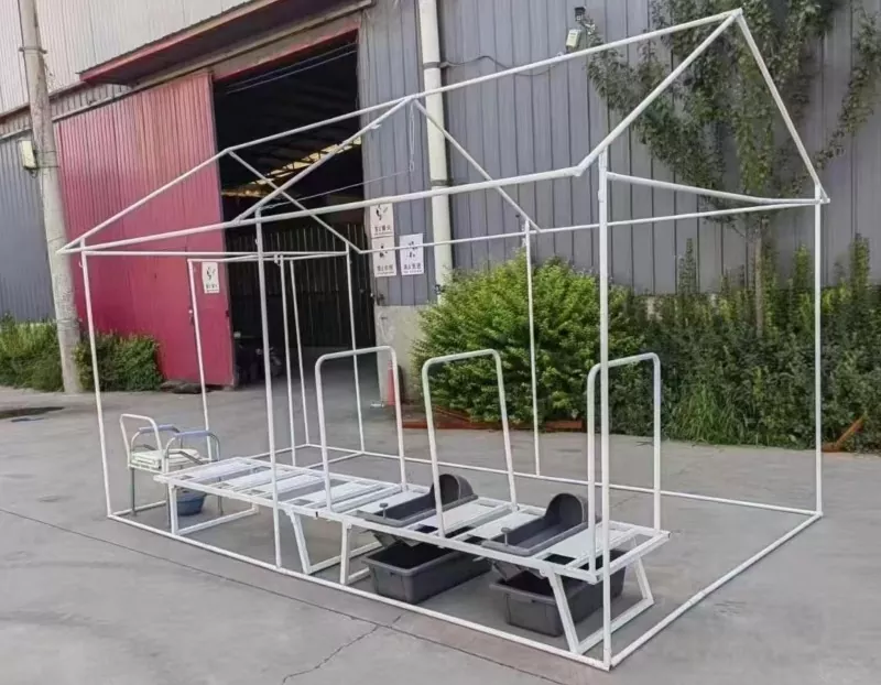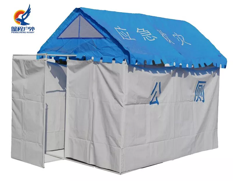 Fabrikita de Pengcheng Outdoor en siaj propraj fabrikoj en Ĉinio, la Necesejo-Tendo de Kriz-Kazakatastrofo havas duoblan deklivan vertikalan murstrukturon - fortika, facile konservebla, rapide muntebla, pluvrezista kaj daŭra. Taŭga por diversaj katastrofaj savaj scenoj, ĝi renkontas la postulon pri provizoraj kloakiginstalaĵoj.